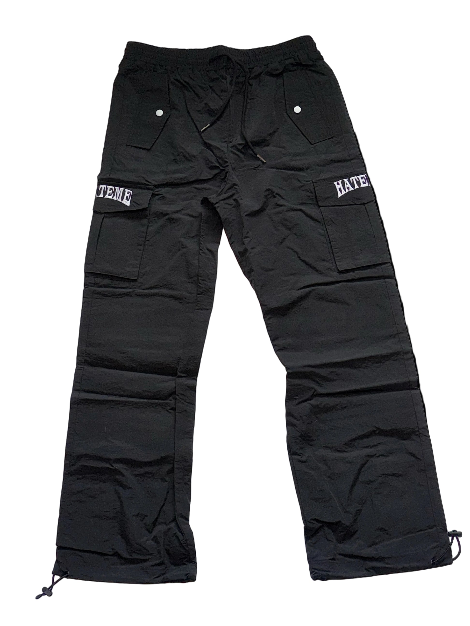 These high-quality black nylon cargo pants feature a straight leg fit and an adjustable leg opening, allowing for personalized comfort and versatility. The durable nylon fabric is resistant to wear, making these pants suitable for various activities while providing ease of movement.